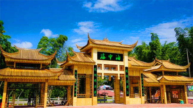 站在“海中?!钡拇蟮躺戏叛圻h眺,湖水明凈清澈,遠處翠綠的小島,把寬廣的湖面分成兩半,伸向蒼莽的竹林中,顯得深邃幽遠。