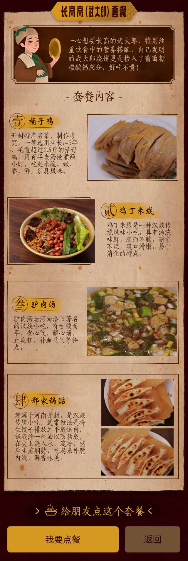 進(jìn)入H5頁(yè)面后,在大宋繁華夜景的映襯下,點(diǎn)擊“一起去逛逛吧”按鈕即可進(jìn)入大宋網(wǎng)紅套餐主頁(yè)面,在這里就可以看到各個(gè)網(wǎng)紅套餐。第一個(gè)“長(zhǎng)高高(武大郎)套餐”,為那些希望長(zhǎng)高高的小伙伴們量身定制,包含了桶子雞、驢肉湯等各種有助長(zhǎng)高的營(yíng)養(yǎng)美食,擬人化的套餐名稱和個(gè)性介紹,不僅能激發(fā)廣大游客爭(zhēng)相品鮮,還可以順帶傳播厚重宋文化。