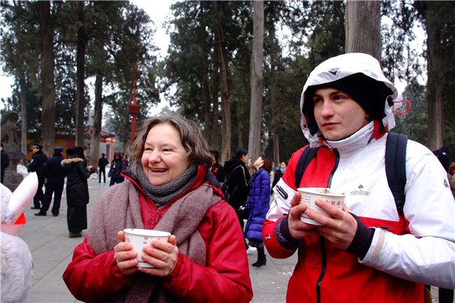 圖:手捧臘八粥的國(guó)際友人