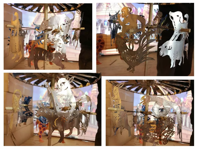 此燈籠全部采用高粱稈+燈籠紙全手工制成,主要依靠蠟燭加熱空氣,模仿蒸汽機(jī)原理,以推動(dòng)走馬燈的旋轉(zhuǎn)。內(nèi)部是純手工裁剪的十二生肖以及西游記師徒四人,造成一種投影現(xiàn)象。