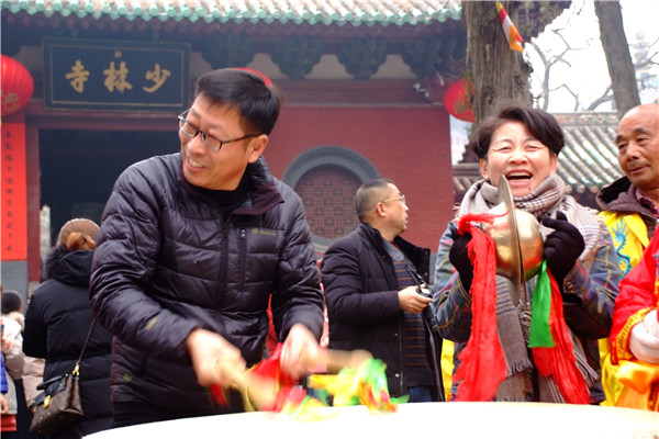 演出間隙,游客們紛紛上前,拿起道具,希望自己也能夠過一把“表演癮”。來自鄭州的黃先生女兒五年前遠(yuǎn)嫁山東,自2013年起,夫婦兩人每年正月初三都要來少林寺上香祈福。他們一方面想在佛祖面前為女兒祈福許愿,另一方面也是享受一下工作之余難得的二人世界。
