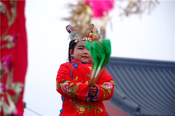 上午九點(diǎn)半,河南省非物質(zhì)文化遺產(chǎn)“穎陽(yáng)鬧歌”在少林景區(qū)游客廣場(chǎng)亮相。這種古老的民間社火表演形式距今已有300多年歷史,是河南民俗表演的一絕。演出期間,所有演員均扮作古裝戲曲中的人物形象,成年演員腳踩音樂鼓點(diǎn),隨之變換隊(duì)形。小孩們則作為道具被頂在頭上,不斷舞動(dòng)手臂,擺出各種姿勢(shì),與游客進(jìn)行互動(dòng)。