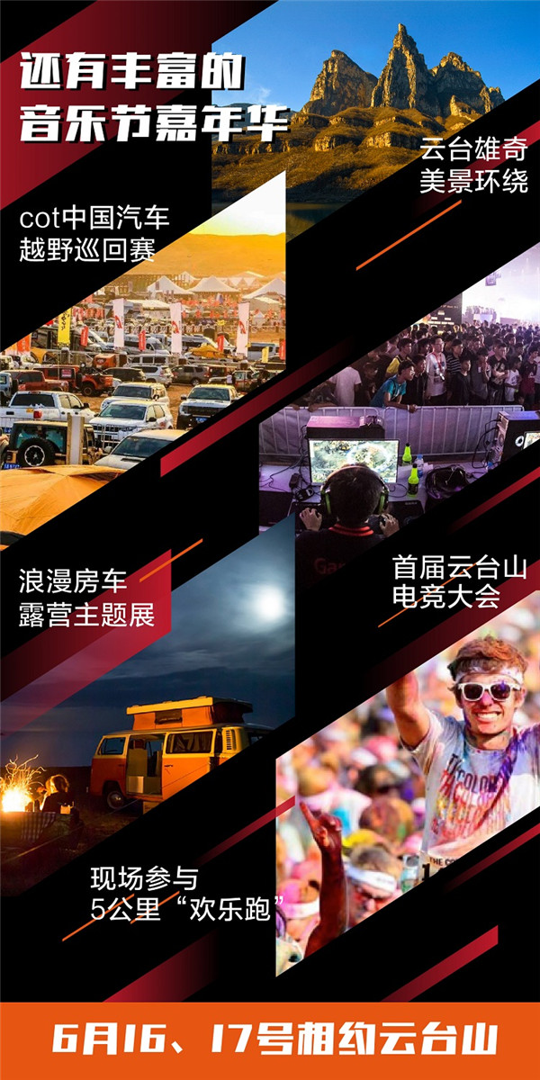 活動期間,汽車越野賽將于6月15-18日在景區(qū)五家臺賽車場舉辦,賽道全長1.8公里,主要分為專業(yè)組、公開組、量產組、女子組、越野江湖UTV錦標賽,200多名專業(yè)車手將為廣大游客奉獻一場充滿速度與激情的賽車競技盛宴。首屆云臺山音樂節(jié)在6月16-17日舉辦,活動場地設在云臺山景區(qū)百家?guī)r停車場南側活動廣場,音樂節(jié)邀請了崔健、反光鏡、南征北戰(zhàn)NZBZ、逃跑計劃等中國經典搖滾以及新派搖滾代表,為廣大游客帶來搖滾與電音雙重舞臺享受。同時音樂節(jié)現(xiàn)場還設置了7大主題區(qū)域近20項特色藝術美陳聲光電裝置,包括慵懶街餐車美食區(qū)、光之拱門、投影光繪墻、時光洞穴、星空剪影發(fā)光球、音樂氣泡迷宮等超級網紅打卡地,以及街舞快閃、非洲鼓、激光涂鴉等多個潮玩互動項目,為觀眾帶來多元、趣味的超值互動體驗。首屆云臺山電競大會6月15-17日將在景區(qū)百家?guī)r停車場大車一區(qū)舉辦,《王者榮耀》云臺山爭霸賽已進行線上預選,64支戰(zhàn)隊300余名電競愛好者,經選拔16支戰(zhàn)隊晉級云臺山電競大會線下總決賽,角逐十萬大獎。云臺山房車展6月15-18日在百家?guī)r大巴停車場五區(qū)展覽,展會期間這里將匯集奔馳、寶馬、宇通、速騰等知名廠家的特色高端房車和改裝車,為游客帶來全新的房車盛宴。同時,主題研討會“房車與露營發(fā)展高峰論壇”也將在云臺天階國際飯店舉辦。炫彩歡樂跑于6月15日在云臺山百家?guī)r舉辦,全程5公里,每公里設置一個彩色站,將有1000余名參賽者互相拋灑彩粉,歡樂奔跑。