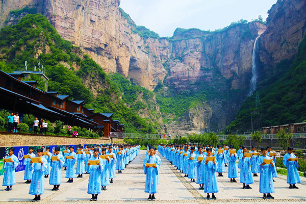 千名身著漢服的中學(xué)生在碧水丹山間誦讀《離騷》《詩(shī)經(jīng)》等國(guó)學(xué)經(jīng)典詩(shī)文活動(dòng)是寶泉景區(qū)此次端午節(jié)活動(dòng)的最大亮點(diǎn)。