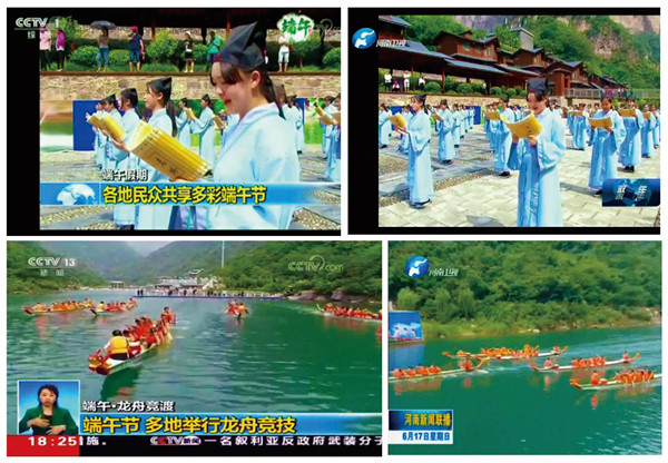 “長(zhǎng)太息以掩涕兮,哀民生之多艱?!薄安接囫R于蘭皋兮,馳椒丘且焉止息。 進(jìn)不入以離尤兮,退將復(fù)修吾初服?!薄瓣P(guān)關(guān)雎鳩,在河之洲,窈窕淑女,君子好逑?!碑?dāng)這些千古傳頌的經(jīng)典詩(shī)文在配以古典背景音樂(lè)的山水間郎朗誦讀時(shí),同學(xué)們油然而生對(duì)博大精深國(guó)學(xué)的感悟,對(duì)古人先賢智慧的膜拜,還有屈原所代表的民族精神的敬畏?,F(xiàn)場(chǎng)游客紛紛被這種緬懷先賢,弘揚(yáng)中華傳統(tǒng)優(yōu)秀文化的形式震撼,感言說(shuō)不僅觀賞了太行寶泉碧水丹山的美景,還感受到了濃濃的端午氛圍,更受到了一份生動(dòng)具體的愛(ài)國(guó)主義教育,此次旅游,有生難忘!活動(dòng)還吸引了眾多主流媒體爭(zhēng)先報(bào)道,在CCTV1、CCTV13、河南衛(wèi)視、新鄉(xiāng)電視臺(tái)的新聞欄目中均有報(bào)道。人民網(wǎng)、新華網(wǎng)、大豫網(wǎng)等各大主流網(wǎng)絡(luò)媒體也相繼報(bào)道。