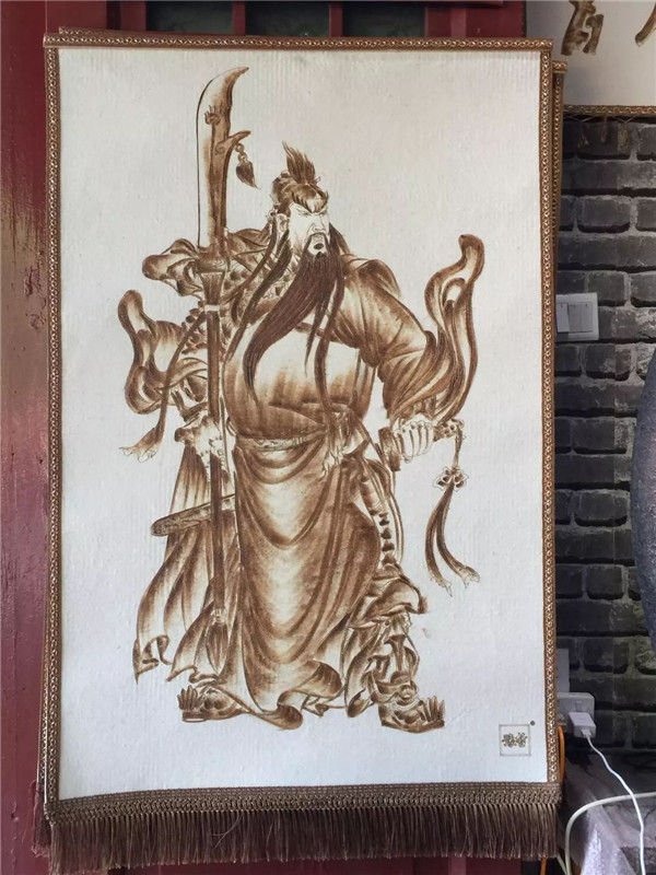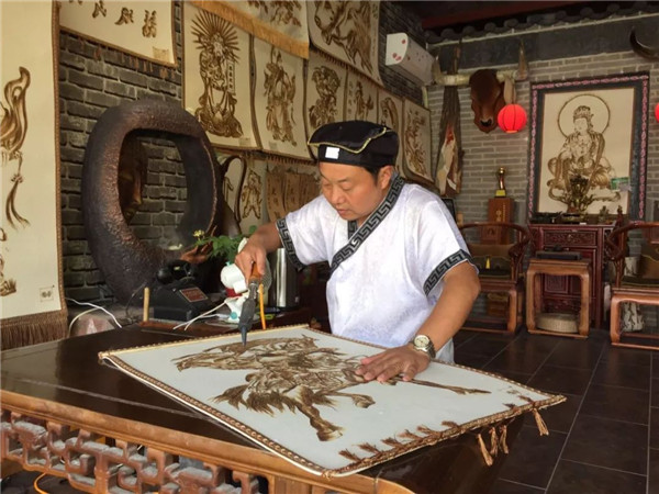 用烙鐵在羊毛毯上烙出各種人物、花鳥、風(fēng)景等作品,