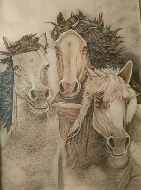 其作品:《關(guān)公》、《駿馬圖》、《猛虎》等皆是栩栩如生,