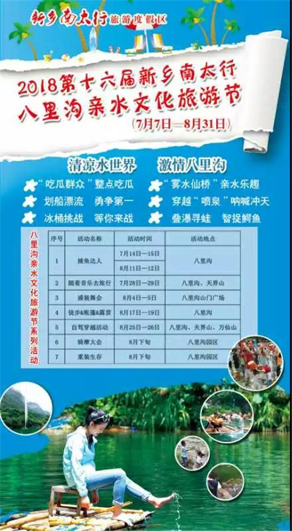 本屆親水文化旅游節(jié)由新鄉(xiāng)南太行旅游有限公司傾情打造,全方位營(yíng)造歡樂、清爽的親水氛圍,盛情邀約八方游客觀賞水奇觀、體驗(yàn)水樂趣、感受水文化。此次親水文化旅游節(jié)活動(dòng)內(nèi)容豐富多彩,驚喜連連!在二仙橋,你可以穿越“霧水仙橋”,盡情濕身;在桃花灣,你可以盡享賽船漂流,勇爭(zhēng)第一;在馬武居,你可以持水槍搶冰桶,潑水大戰(zhàn);在大瀑布,你還可以穿越飛瀑,“洞觀”天河……更有“吃瓜群眾”、“吶喊沖天”、“疊瀑覓鱷”、“水底尋寶”等搞笑、刺激的精彩節(jié)目等你來(lái)嗨。