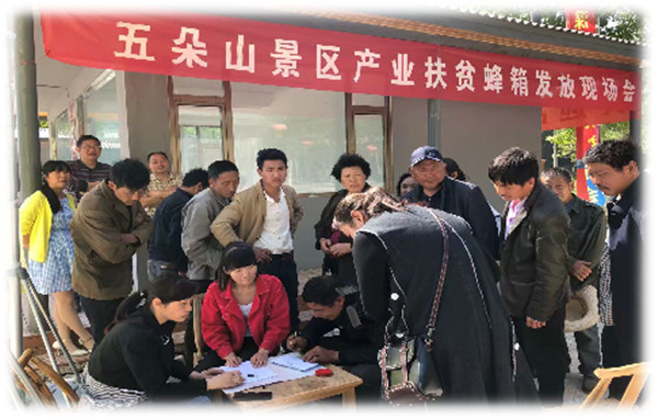 五、“產(chǎn)業(yè)幫扶+技能培訓(xùn)”帶貧模式。五朵山景區(qū)面積126平方公里,區(qū)內(nèi)有8個行政村,80個自然村,總?cè)丝?972 人,景區(qū)群眾的綜合素質(zhì)與景區(qū)形象榮辱與共,公司始終堅(jiān)持把景區(qū)發(fā)展、產(chǎn)業(yè)扶貧和提升景區(qū)群眾綜合素質(zhì)有機(jī)結(jié)合起來,依托公司平臺與合作社平臺,建立常態(tài)化的旅游人才和產(chǎn)業(yè)技能培訓(xùn)機(jī)制。一是結(jié)合景區(qū)形象提升工程,常年組織對景區(qū)住戶和群眾導(dǎo)游開展文明禮儀培訓(xùn),引導(dǎo)景區(qū)群眾文明待客。二是不定期組織農(nóng)家客棧、特色民宿、“扶貧商鋪”經(jīng)營者外出參觀考察,學(xué)習(xí)先進(jìn)的經(jīng)營管理經(jīng)驗(yàn),培育鄉(xiāng)村旅游帶頭人。三是依托合作社平臺,不定期開展種植、養(yǎng)殖、特色產(chǎn)品加工等實(shí)用技術(shù)培訓(xùn),提高社員群眾致富能力。近兩年來,已先后組織各類培訓(xùn)9次,累計(jì)參與培訓(xùn)群眾380余人次。今年上半年,根據(jù)中華野山蜂養(yǎng)殖基地建設(shè)的群眾需要,公司聯(lián)合合作社聘請縣內(nèi)養(yǎng)蜂專家專門組織了養(yǎng)蜂技術(shù)培訓(xùn),培訓(xùn)結(jié)束后,公司現(xiàn)場為有養(yǎng)殖意向的67 戶貧困戶無償發(fā)放蜂箱300 個。按公司包銷價(jià)格計(jì)算,僅此一項(xiàng)產(chǎn)業(yè),預(yù)計(jì)可帶動67戶貧困戶年均增收4000元。