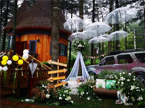 各種卡通、動(dòng)物、親子、電影、情侶主題的抖音網(wǎng)紅木屋刷新旅行休閑新姿勢(shì)!在木屋聊天、打牌、玩桌游。高仿真定制空投箱,吉利服、平底鍋、頭盔等意想不到的吃雞道具,森林版真人吃雞大戰(zhàn)。