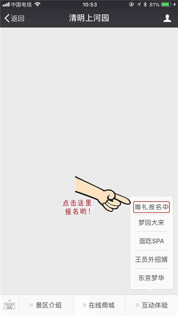 05“準(zhǔn)新人”可攜帶化妝師1人、伴郎1人、伴娘1人及雙方父母4人免費(fèi)入園參與活動(dòng),可在活動(dòng)當(dāng)天免費(fèi)享受由景區(qū)精心籌備的大宋喜宴;