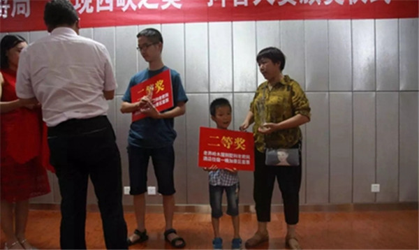 西峽縣旅游局領(lǐng)導王金營和謝靈芝同志為三等獎獲獎選手頒獎