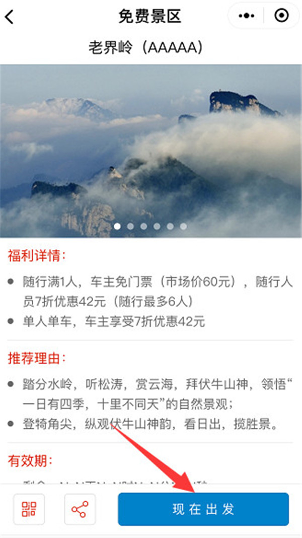 此外,點開您要自駕去的目的地景區(qū),除了景區(qū)的美景圖片和重要提示外,還有方便快捷的導航服務—點擊右下角的“現(xiàn)在出發(fā)”,就可以調用您手機上的電子地圖,直達景區(qū)入口。