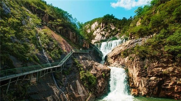 “中原一絕,人間仙境”,大小19道瀑布和72潭,群瀑疊落飛瀉直下,潭深水幽奇石遍布。龍?zhí)稖希俨济芗?,融山秀、石奇、水澈、林茂、潭幽連一體,形成中原大地罕見的水蝕地貌景觀,被譽為“中原第一瀑布群,天然奇石博物館”。