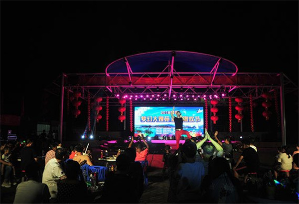 全民撒歡足球賽,主題晚會亦精彩。足球賽事結(jié)束后,主題撒歡晚會震撼呈現(xiàn),多位實力表演嘉賓傾情助陣,用勁爆的搖滾、古風的舞蹈、精彩的反串、魔幻的變臉和天籟般的歌聲,為眾多游客奉獻了一場多彩的視聽盛宴?!皳u擺丹江”有獎互動環(huán)節(jié),無論男女,不分老幼,紛紛上臺大秀搖擺絕技,徹底沉浸在丹江大觀苑激情撒歡節(jié)的火熱氛圍中,歡呼上、吶喊聲響徹夜空,整個晚會現(xiàn)場變成了全民撒歡的歡樂海洋。
