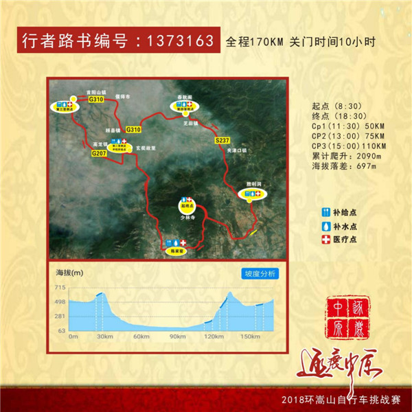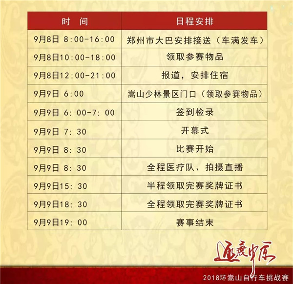 騎行天地之中·弘揚(yáng)中國(guó)功夫,經(jīng)過(guò)緊張的籌備,逐鹿中原·少林爭(zhēng)鋒2018環(huán)嵩山自行車挑戰(zhàn)賽即將于2018年9月9日上午8:30在登封市嵩山少林景區(qū)廣場(chǎng)鳴槍開賽。