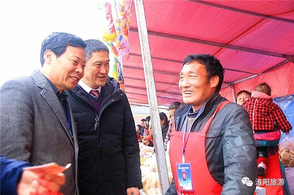 河南省旅游局副局長李延慶(左一)、淮陽縣人民政府縣長王毅(中)與貧困戶經(jīng)營者交流