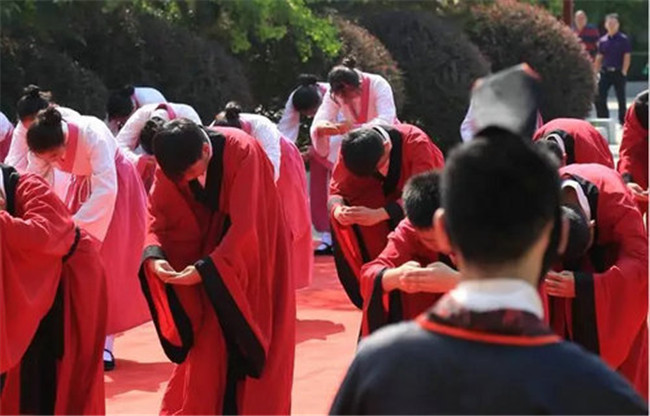 儀式上,學(xué)子們朝圣揖孔,向孔老夫子表達(dá)敬意。致敬中國儒家文化的同時(shí),又向老師行叩首禮,一拜一叩間,流露出感人的師生情誼。