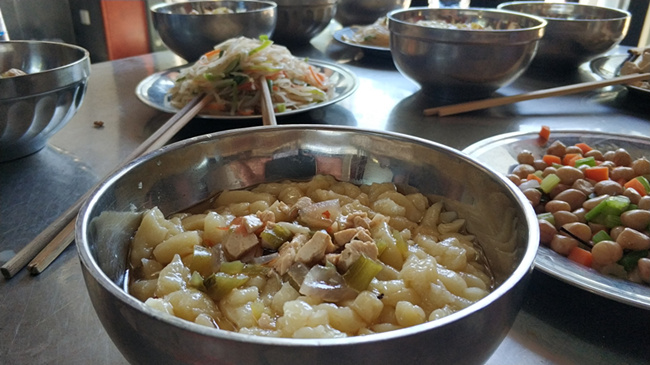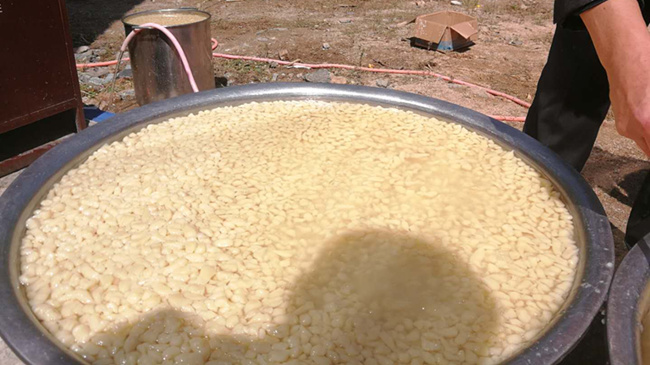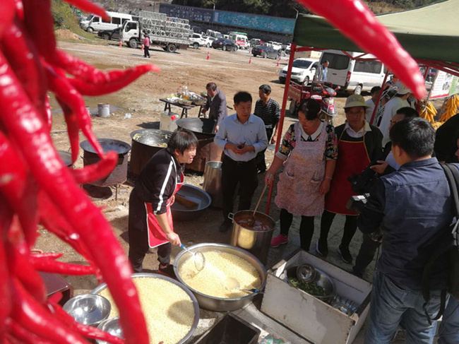 千人共享蝌蚪宴,山中美味引客來(lái)。蝌蚪面是欒川地方傳統(tǒng)小吃之一,由玉米面經(jīng)漏勺滴漏后做成,是地道的粗糧養(yǎng)生美食。21日啟動(dòng)儀式上,當(dāng)?shù)卮迕駥⒔鹎镓S收的欒川高山玉米,磨成玉米面,支起大鍋現(xiàn)場(chǎng)制作欒川特色美食蝌蚪面。金黃的蝌蚪面,配上青椒、大蒜、豆角、花生油、香菇等天然食材炒制的調(diào)味醬,簡(jiǎn)直是色香味俱全。今秋五谷豐登大豐收,村民拿出最好的收成大擺宴席,歡慶豐收年。