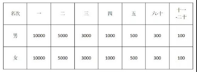 男、女前20名,分別獲得獎(jiǎng)金或等值獎(jiǎng)品(見(jiàn)下表,單位:人民幣)、獎(jiǎng)牌一枚,男女前三名參賽者各頒發(fā)獎(jiǎng)杯一座。