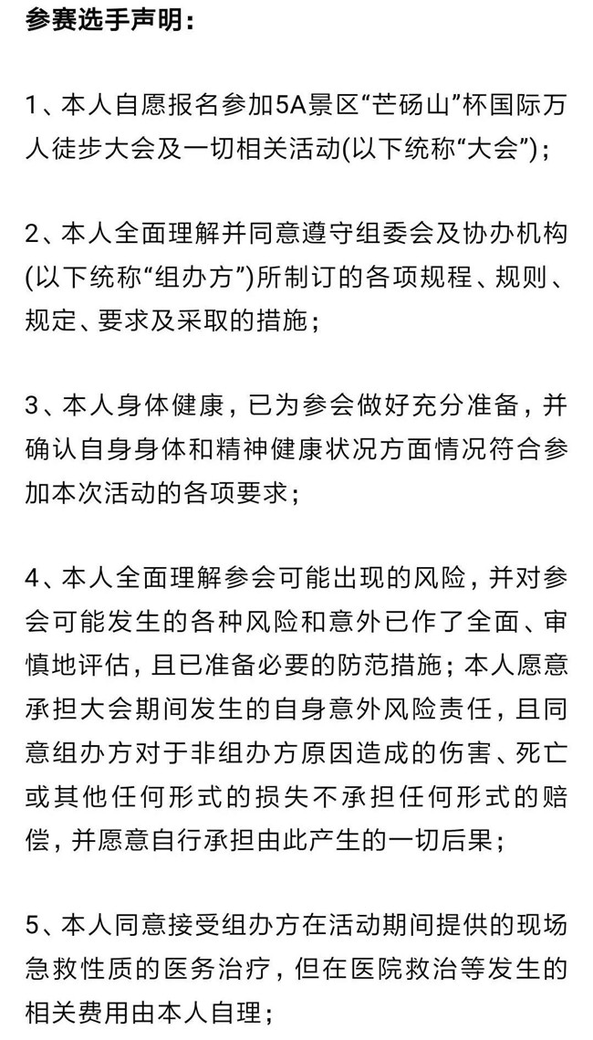 (四)參賽者如有高血壓、心臟病史及妨礙劇烈運(yùn)動(dòng)的其他疾病,報(bào)名時(shí)須提供近期縣級(jí)醫(yī)院以上的健康證明。如有隱瞞病史,參加賽事活動(dòng),造成的一切后果由參賽者本人自行承擔(dān)。