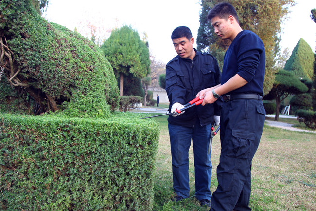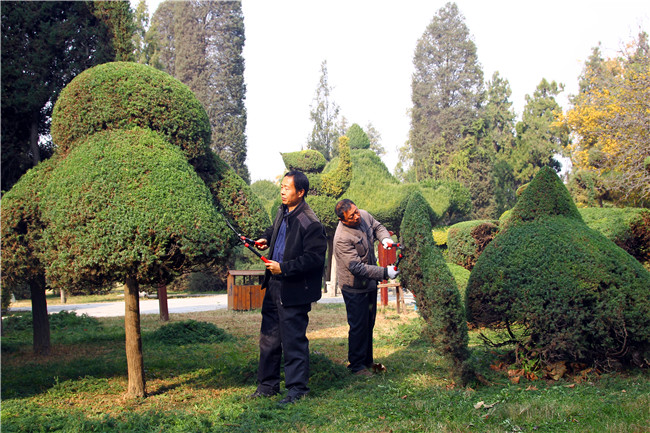 剪枝需要技藝。太昊陵松柏造型剪枝技藝已有120年的歷史。創(chuàng)始人王殿一。18歲時(shí)王殿一在自己家中(城關(guān)鎮(zhèn)王花園村)栽植松柏,以樹(shù)為題,以剪代筆,修剪出動(dòng)物、建筑等造型,首創(chuàng)松柏造型剪枝技藝。1957年淮陽(yáng)縣在太昊陵建設(shè)人民公園,由兒子王月惠牽頭,將家中松柏造型全部遷植到太昊陵?yáng)|南側(cè)。王殿一去世。王月惠繼承遺愿,幾十年如一日,從事松柏造型制作發(fā)展,并將松柏藝術(shù)造型手法言傳身教,培養(yǎng)了子女王廷林、王綠梅、王廷安以及孫子王福。同時(shí)培養(yǎng)了劉華宣、袁芳靜、于天振、趙桂民等一批松柏造型技術(shù)骨干。王月惠去世后,以老帶新,又培養(yǎng)出了黃新義、任全生、王文龍、張勇、齊森森、張乾坤、王子路、張建興、劉然等一大批技術(shù)骨干。老中青結(jié)合,骨干力量雄厚。特別是新生力量王文龍、張勇、齊森森、張乾坤、王子路、張建興、劉然他們幾個(gè),雖然年輕,但已經(jīng)都是能獨(dú)擋一面的技術(shù)骨干分子了。