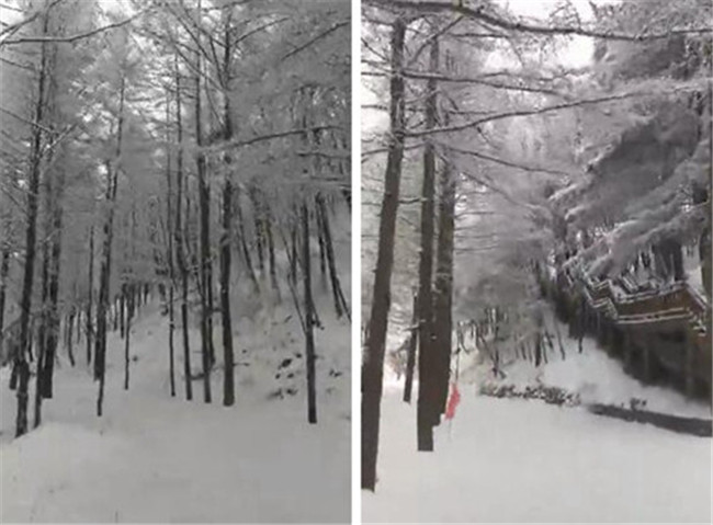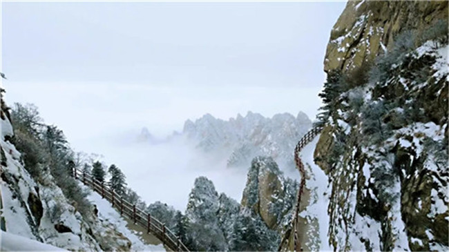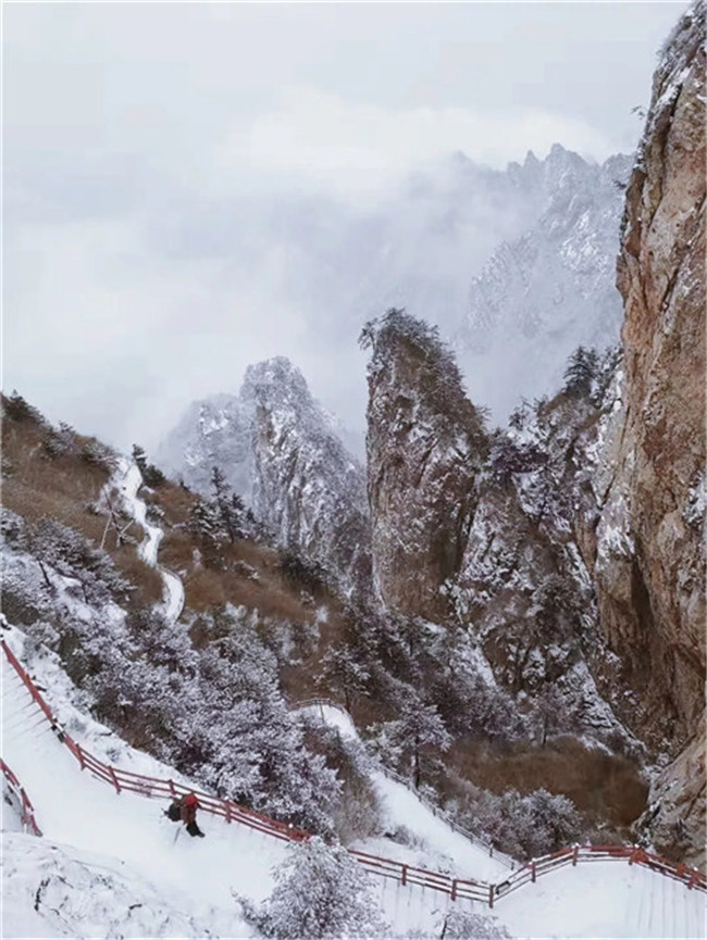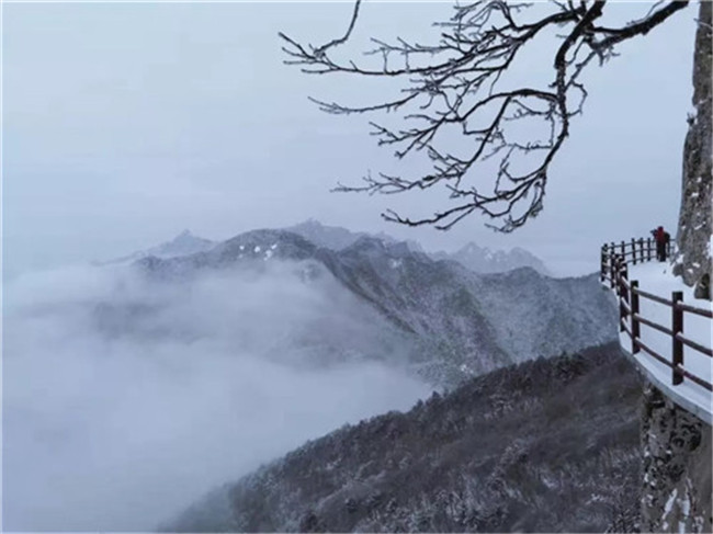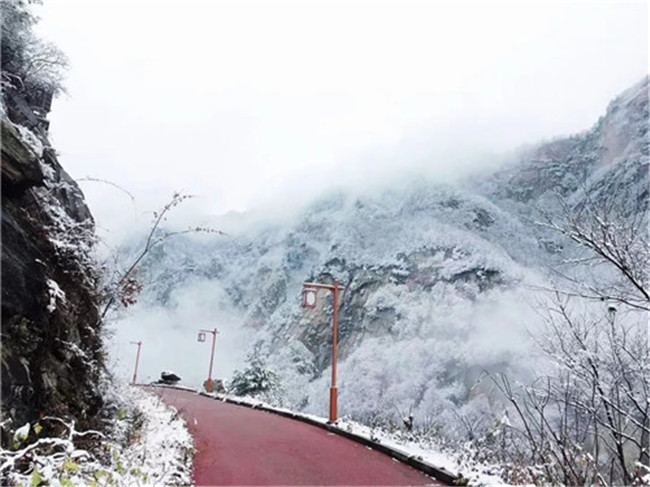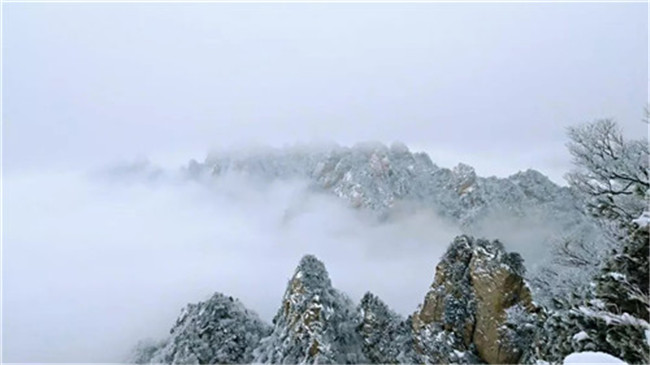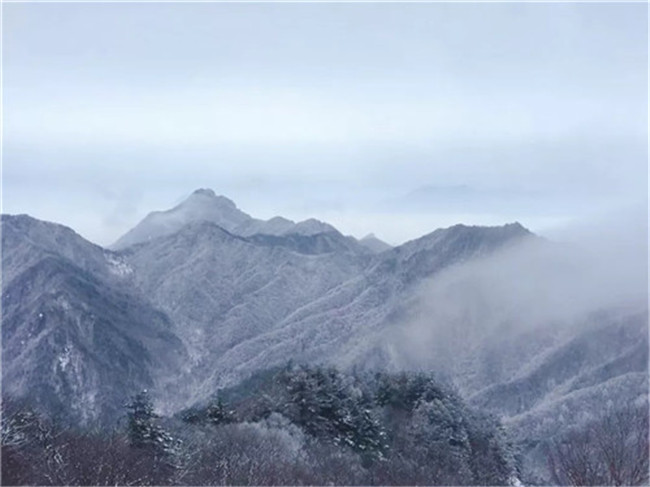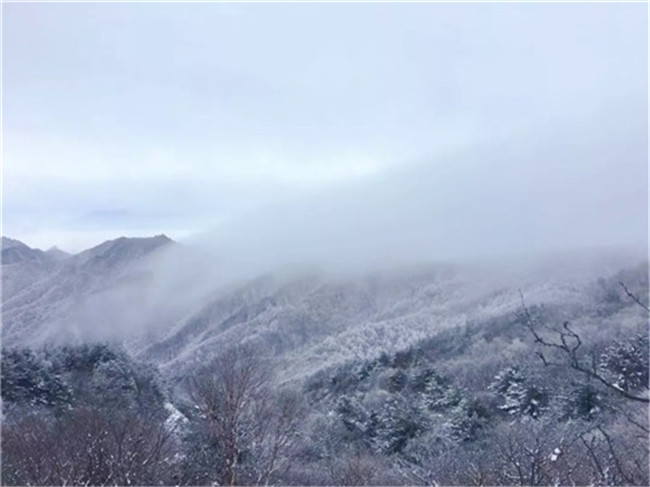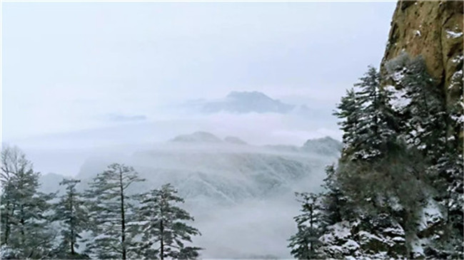飛雪飄零,幾經(jīng)渲染,山巒上銀裝素裹,玉樹(shù)冰花,仿佛置身于高雅的水墨世界。