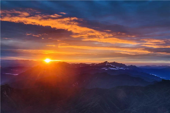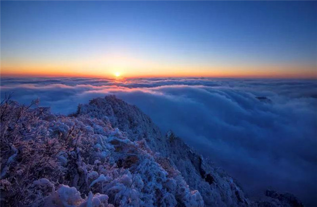 老君山的日出瑰麗榮華,這是晨光與黑夜交替的時刻。你乍看上去,黑色還似乎強大無邊,可是一轉(zhuǎn)眼,清冷的晨曦變?yōu)槌嗉t色的光芒。太陽翻登了云背,臨照在天空……觀日出奇景,體會著李世民那句“拂曉云布色,穿浪日舒光”的旖旎。