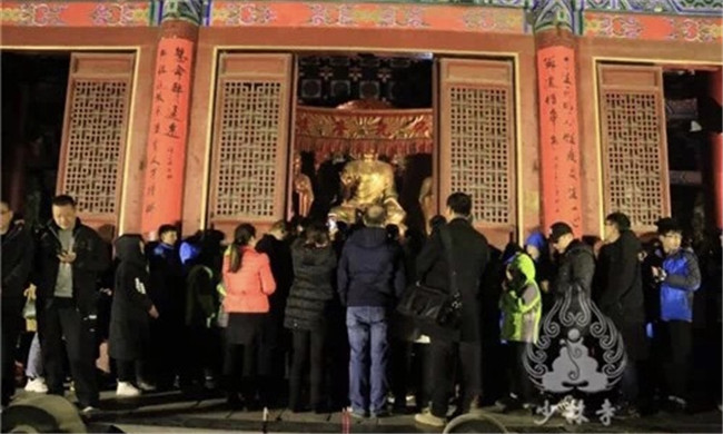 除夕夜,在少林寺院內(nèi)舉行供燈撞鐘祈?;顒?dòng),聞少林鐘聲迎新春,祈福家人身體健康、事業(yè)有成。