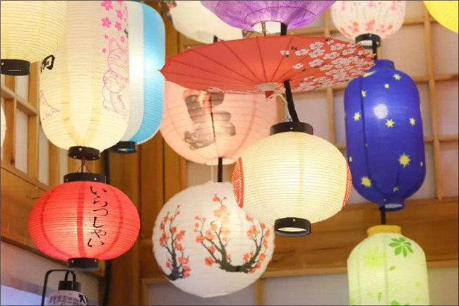 東亞館四周點(diǎn)綴日韓壁燈及落地?zé)簦鎵Ρ跒槿毡景l(fā)光櫻花樹枝,制作的一個(gè)浮雕式日本冬瓜燈,兩側(cè)擺有日韓特色的擺件,極具東亞特色。東南亞館