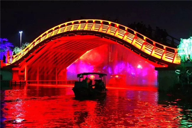 清明上河園內(nèi)的汴河一段是清園的靈動(dòng)所在,從高空俯瞰,汴河半圍繞又鑲嵌其中,給整個(gè)園區(qū)帶來(lái)了生命力和動(dòng)感。平日里,大批量的游客集聚在東京碼頭、雙亭橋碼頭、虹橋碼頭等主要碼頭,船夫操著一口地道的老開(kāi)封:上船吧!游客們瞬間就會(huì)被吸引,因?yàn)樵诖峡辞鍒@的風(fēng)景,又是一番姿色,和家人在一起,兩岸的燈光,顯得更加溫馨。人在船上坐,船在畫(huà)中游。夜游清園,隨船而行,一步一景,美不勝收。