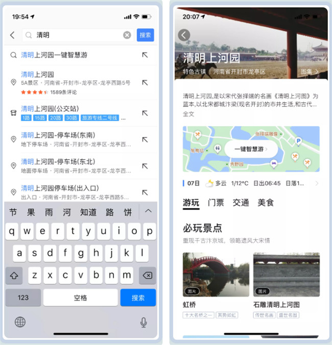 一張地圖游清明上河園”是雙方聯(lián)合打造的線上導(dǎo)覽服務(wù)。在高德地圖上搜索“清明上河園一鍵智慧游”,當(dāng)年的盛世繁華便可展現(xiàn)出來(lái),游客如同身臨其境的行走在《清明上河圖》中,感受傳世名畫(huà)所描繪的北宋都城汴京(今河南開(kāi)封)的城市面貌。