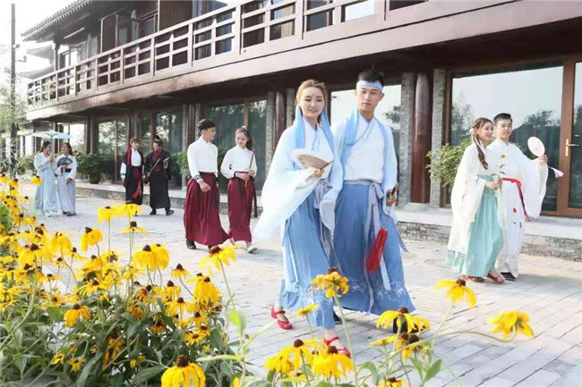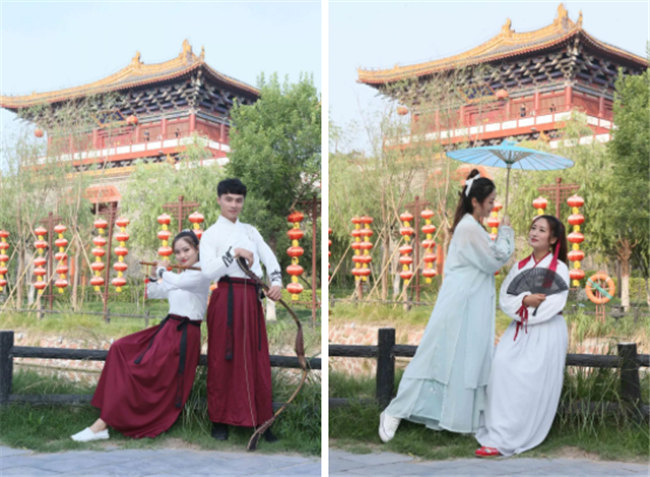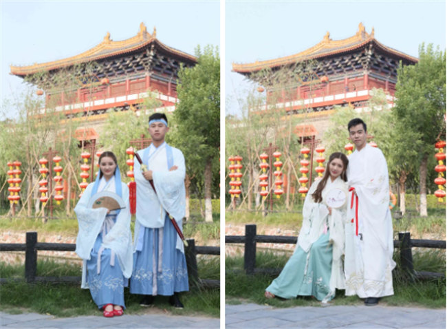 白天的清明上河園樹梢是嫩綠的,花朵是嬌艷的,天空是湛藍(lán)的,心情是美好的。宋裝上新,明媚飄逸,娉娉婷婷,清清淺淺,絢麗多彩的免費宋裝裝飾了春天的斑斕。