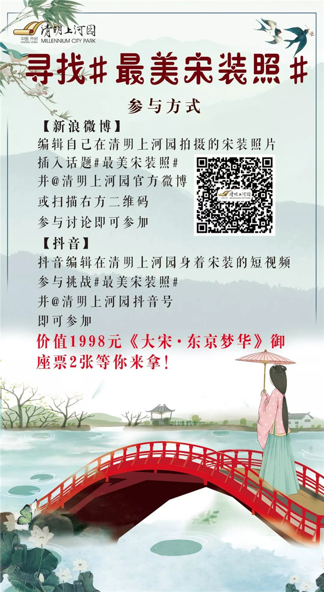 另外,清明文化節(jié)期間,清明上河園尋找“最美宋裝照”活動(dòng)火爆開(kāi)啟,凡在微博及抖音上參加活動(dòng)的游客均有機(jī)會(huì)獲得價(jià)值1998元的《大宋·東京夢(mèng)華》票御座2張。景區(qū)將采用線上與線下相結(jié)合的活動(dòng)方式,將清明文化節(jié)再掀高潮。
