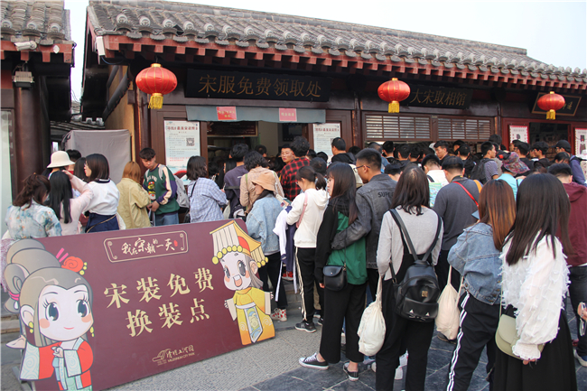 在迎賓門(mén)內(nèi)廣場(chǎng)北側(cè),有免費(fèi)的宋裝可以租賃,在清明小長(zhǎng)假期間,更是排起了長(zhǎng)長(zhǎng)的隊(duì)伍。每一個(gè)負(fù)責(zé)給游客換裝的小姐姐都身穿宋裝,細(xì)心而又負(fù)責(zé)的把衣服盤(pán)點(diǎn)清楚,交代游客注意事項(xiàng)。