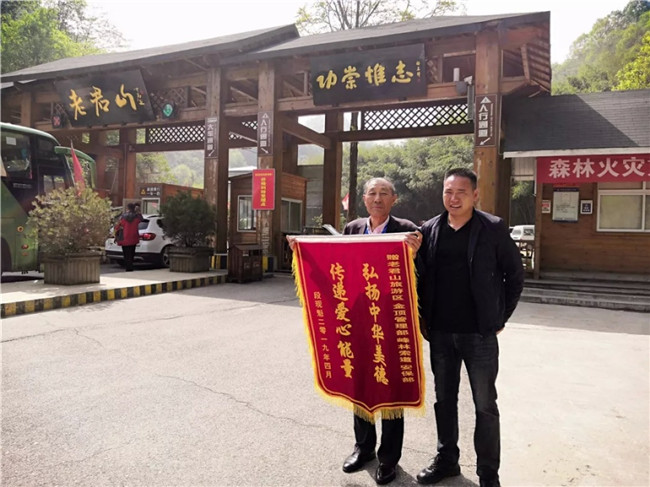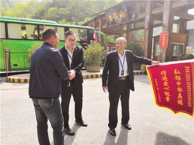 4月25日上午,洛陽市段先生將一面印有“弘揚(yáng)中華美德 傳遞愛心能量”的錦旗送至老君山景區(qū)安保部,并緊緊握住了工作人員的手,激動(dòng)的心情難以言表。