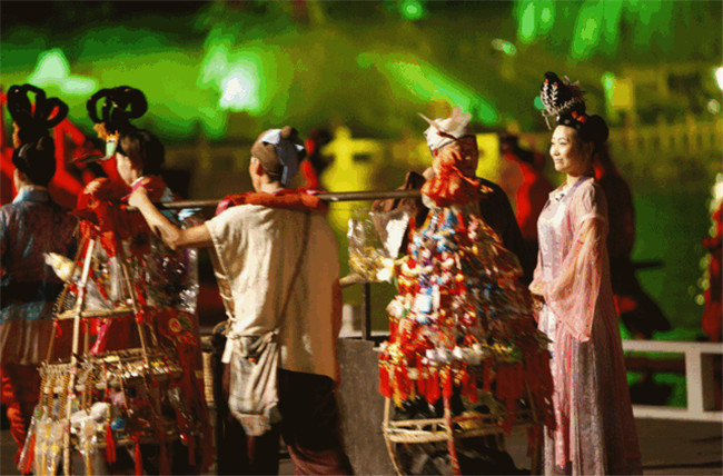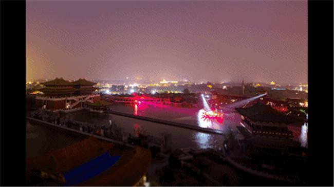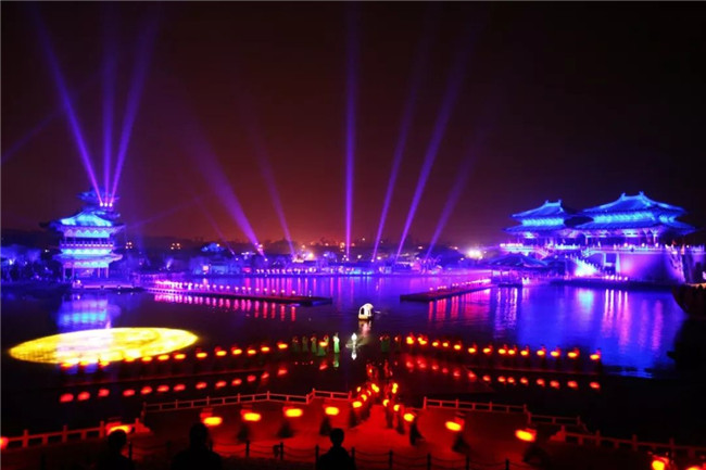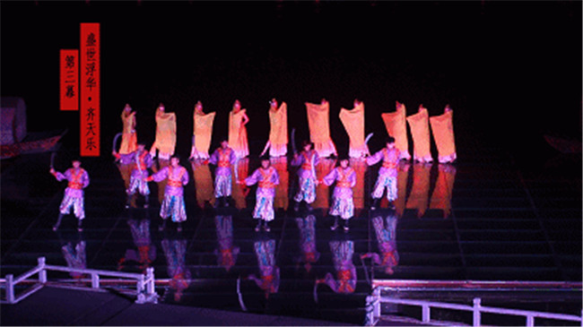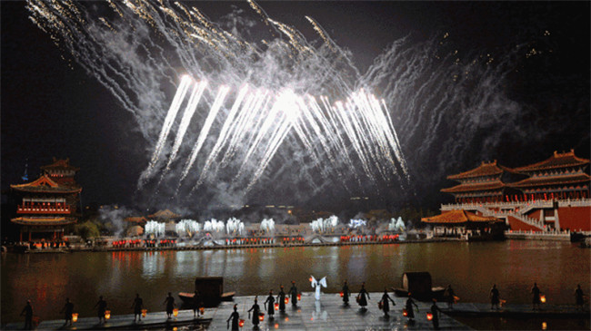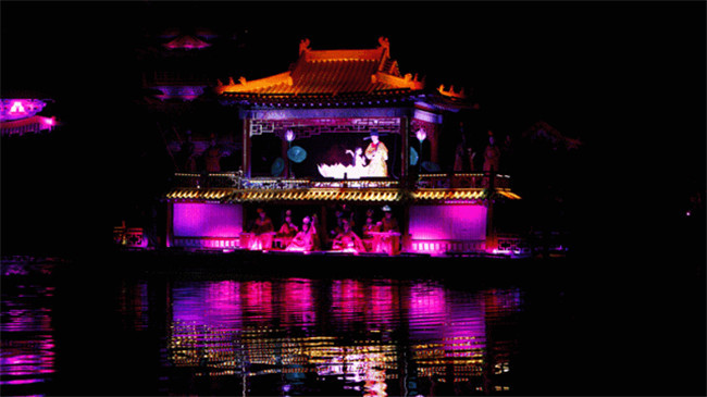 《大宋·東京夢華》是《清明上河圖》和《東京夢華錄》的歷史再現(xiàn)。這場大型水上實景演出,運用八首經(jīng)典宋詞,絢麗的燈光,千人的表演場面,將北宋汴京的繁榮和昌盛表現(xiàn)地淋漓盡致。江江春水掩映點點星光,晶瑩剔透的菊花臺從遠方緩緩飄來,綻開后釋放出五彩霞光,花心深處有十二位身著宋裝的歌女翩翩起舞,粼粼水波,悠悠宋音,訴說著汴京無盡的繁華。