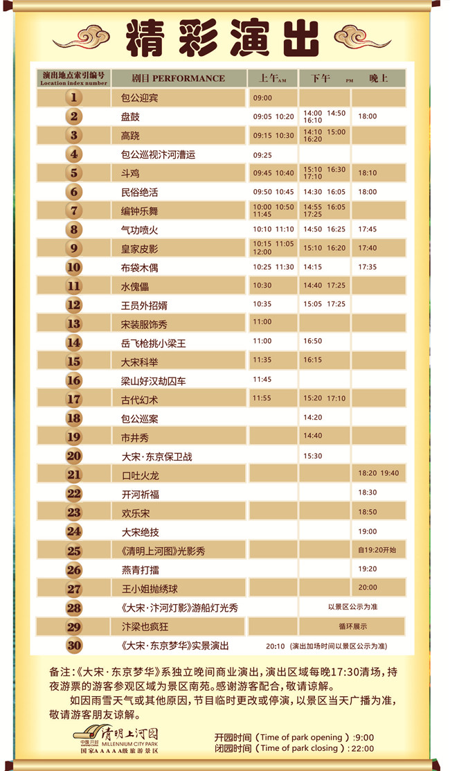 精彩清園,好戲連臺(tái),清明上河園的上百場(chǎng)演出,場(chǎng)場(chǎng)經(jīng)典,不容錯(cuò)過,貼個(gè)節(jié)目單,跟著時(shí)間走,演出不用愁!