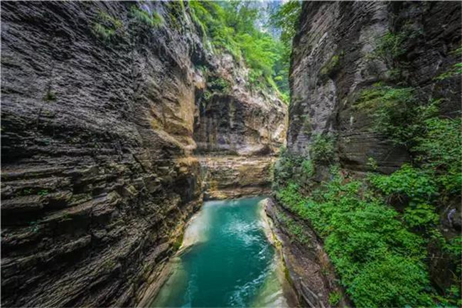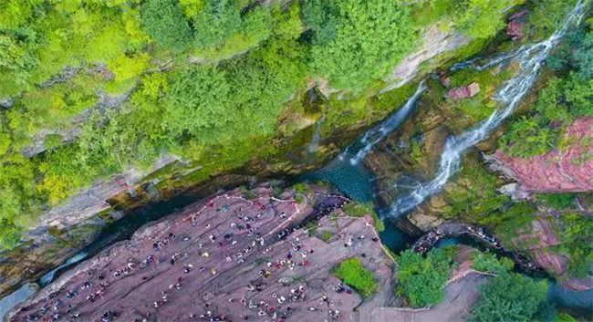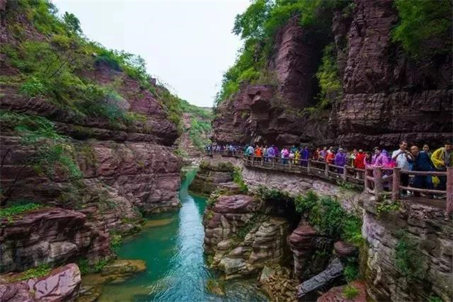 當你走進云臺山,第一眼被震驚就是紅石峽了,整條峽谷處于地表以下,仿佛鬼斧神工雕鑿而成的巨大盆景。紅色的石英砂巖和翡翠般的湖水形成了丹崖碧水的神奇景觀。