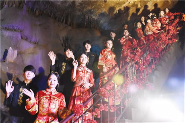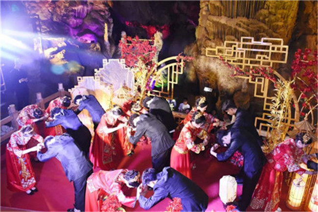 在億萬(wàn)年的地下宮殿里,在中華第一柱前,手挽手入花堂、下團(tuán)扇、結(jié)發(fā)禮、和丞酒、送祝福、頒發(fā)愛(ài)情證書(shū)……在歡快悠揚(yáng)的樂(lè)曲聲中,送入“洞房”……