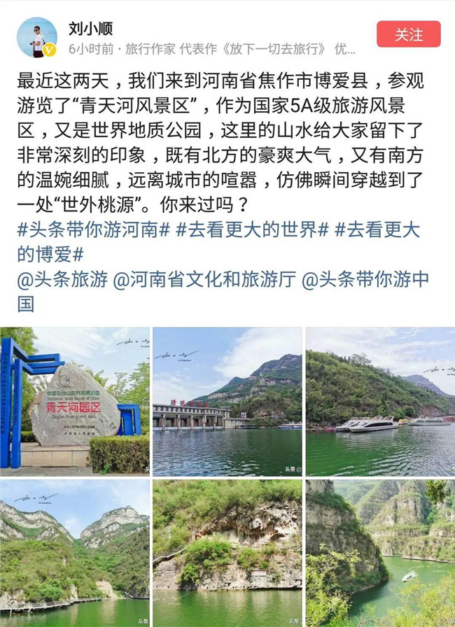 “全球文旅創(chuàng)作者大會(huì)” 是河南省文化和旅游廳聯(lián)合字節(jié)跳動(dòng)公司深入挖掘河南省文化旅游資源,大力推廣宣傳“老家河南”品牌的國(guó)際盛會(huì)。5月30日,文旅達(dá)人走進(jìn)青天河,開啟為期兩天的文旅創(chuàng)作,他們?cè)陬I(lǐng)略博愛山水美景、感受“老家河南”獨(dú)特魅力的同時(shí),也將這里不一樣的詩(shī)和遠(yuǎn)方送到全世界游客的手中!