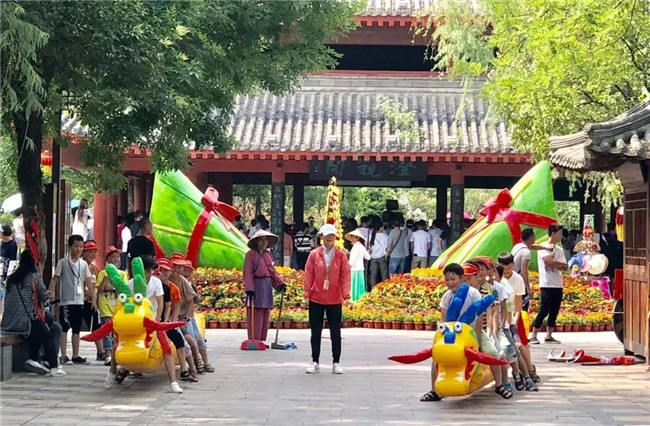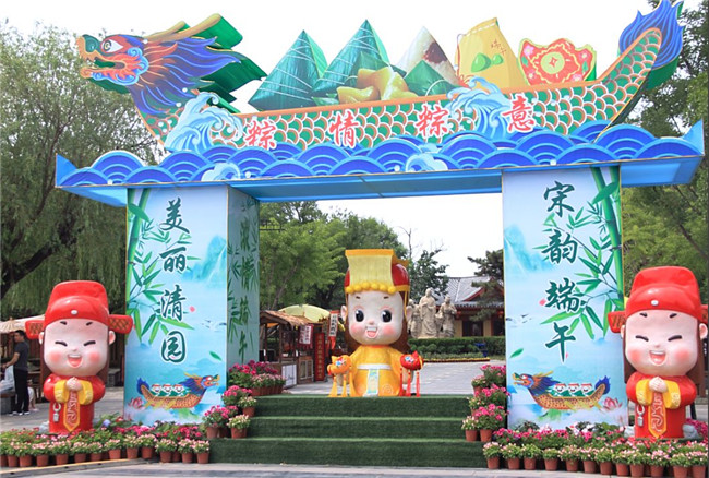 為了讓游客度過一個美麗、熱烈的端午佳節(jié),端午文化節(jié)期間,清明上河園在游客經(jīng)過的主要道路上進(jìn)行了端午氛圍布置。虹橋南側(cè),小皇帝和兩位狀元一起陪你過端午噢~