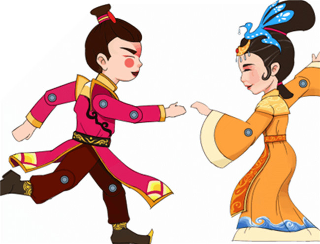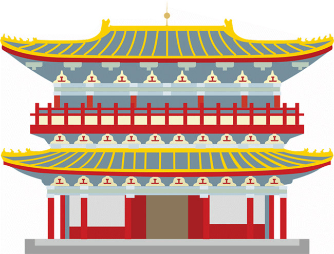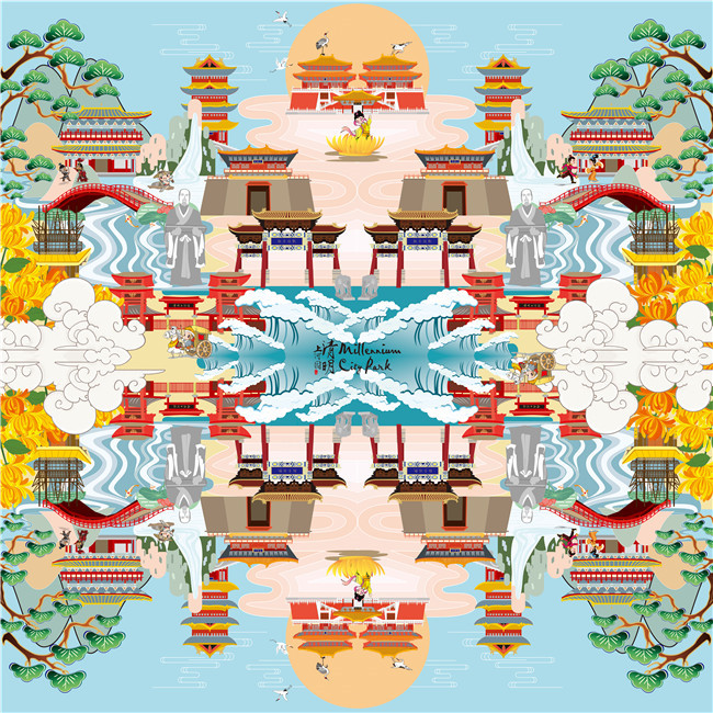 以清明上河園內各種素材,手繪的矢量圖為元素。標志性建筑+標志性卡通形象+清新時尚的配色=