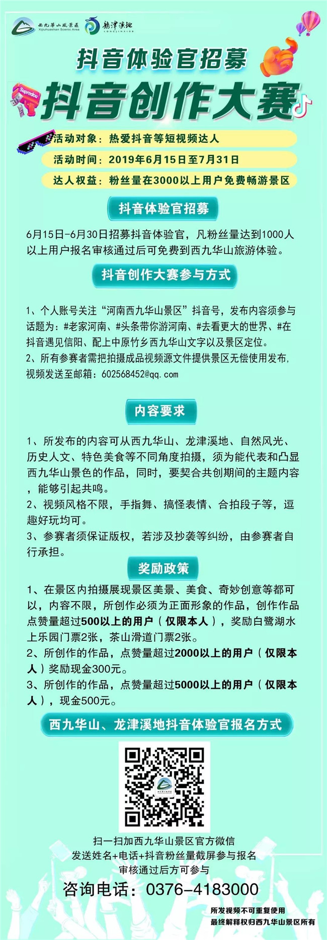 抖音有“毒”,我這有“yao”。只要你有熱情,有勇氣,有實力,來西九華山、龍津溪地景區(qū)拍抖音就可以贏現(xiàn)金大獎!西九華山、龍津溪地抖音體驗官和抖音創(chuàng)作大賽火熱來襲啦!