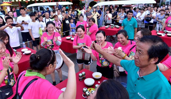 “啤酒之王爭霸賽”作為歷屆重渡溝音樂啤酒節(jié)的經(jīng)典項目,備受游客青睞。“光武大帝賜玉液、鼓聲雷雷飲美酒”,本期啤酒之王爭霸賽主題活動,將承載中國深厚酒文化的酒壇、酒碗,代表地方特色的河洛大鼓等元素融入主題活動中,保留比賽刺激性、競技性的同時,讓活動更添文化性和趣味性。活動現(xiàn)場,光武大帝御賜的十壇美酒醇香清冽,數(shù)萬名來自全國各地的海量達(dá)人,統(tǒng)一身著景區(qū)免費贈送的重渡溝音樂啤酒節(jié)十一周年文化衫,手把海碗,在助陣的累累鼓聲中,仰頭豪飲,在清涼夏日里,感受北國水鄉(xiāng)的無限激情。經(jīng)過激烈角逐,20名選手晉級決賽,決賽舞臺采用喝竹筒酒,竹筒的清香與酒的醇厚讓進(jìn)入決賽的參賽者大呼過癮。之后以喝酒速度評選出一二三等獎,景區(qū)領(lǐng)導(dǎo)現(xiàn)場為其頒獎。爭霸賽期間,萬名游客現(xiàn)場圍觀,加油助威,整個重渡溝變成了一個歡樂的海洋。