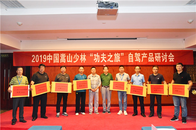 之后,港中旅嵩山景區(qū)黨委書記常務(wù)副總經(jīng)理郭朝宏與河南省自駕旅游協(xié)會(huì)會(huì)長(zhǎng)王東明為到會(huì)的各省自駕協(xié)會(huì)頒發(fā)2019嵩山少林自駕旅游與代言人證書。