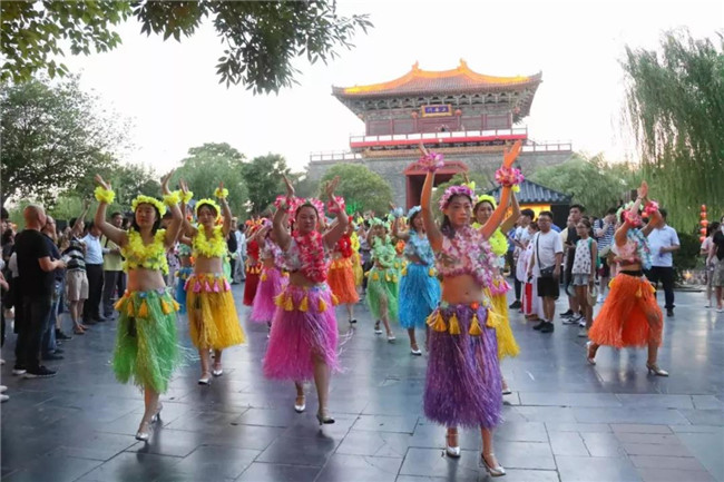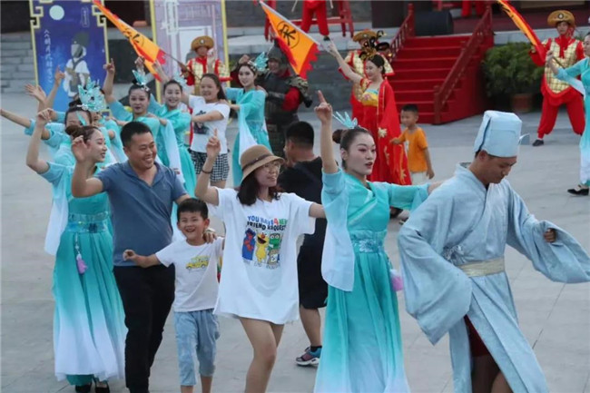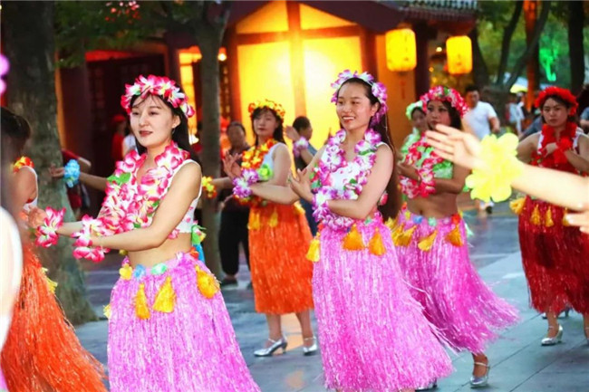 隨著音樂的高潮,游客們興奮的跟著游行隊(duì)伍一起舞蹈,這里瞬間變成了歡樂的海洋。時(shí)間:19:50地址:上善門至雙亭橋碼頭