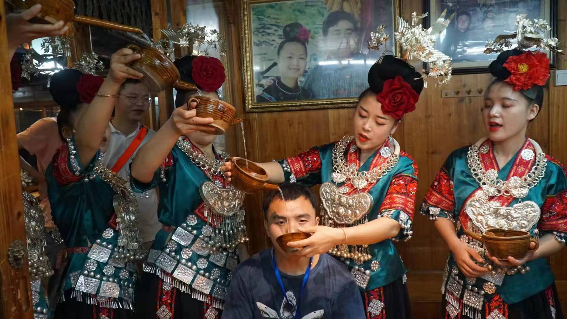 長桌宴的菜肴是當(dāng)?shù)靥厣朗?,酸湯魚、酸湯牛肉、黑毛豬、糯米飯、米酒等,豐富而美味?!肮苣阋炔灰龋家?。”蘆笙吹起來,酒歌唱起來,身著盛裝的苗家阿妹拿著酒器,唱著酒歌向正在用餐的游客嘉賓敬酒。只見她們每人手持一個(gè)酒器,從高往低依次排開,依次倒酒,酒從上往下流,形成高山流水之狀。苗族有“無酒不成席”之說,“高山流水”是苗族獨(dú)特的酒文化。