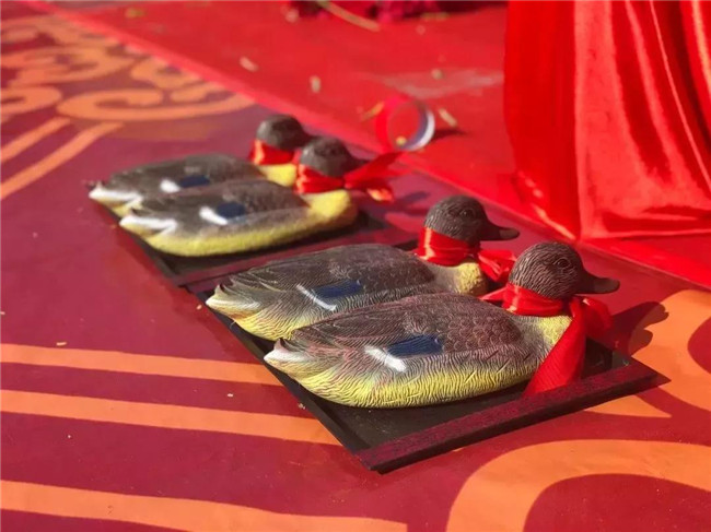在古代的聘娶六禮中,雁是重要禮品。男方至女方家迎親,要先進(jìn)雁為禮,《儀禮》中稱之為“奠雁”。雁一生中只婚配一次,婚配之后便形影不離,二者中若死去一只,另一只則形只影單終生不再婚配。以此寓意夫婦堅(jiān)貞不移、琴瑟和鳴、白頭偕老的美好愿望。后來因?yàn)檠阍絹碓诫y得,人們就改用木刻的雁代之,在此次大宋盛世婚禮中,均是以木雁代替。
