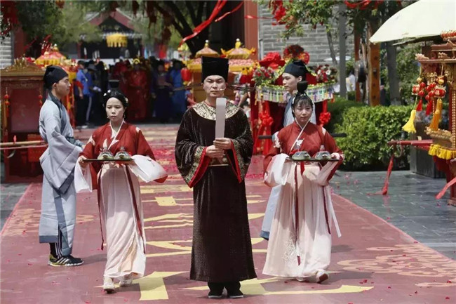 儀式中,有這樣一環(huán)節(jié),侍禮官手執(zhí)笏板,身后跟兩小廝,托鴻雁入場(chǎng),行至典禮區(qū)前,由兩侍女接鴻雁。